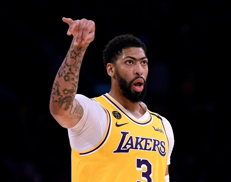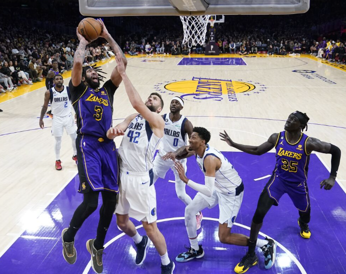 洛杉矶湖人队安东尼戴维斯在对阵达拉斯小牛队的比赛中扣篮。