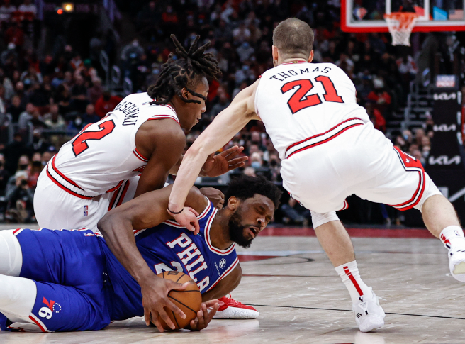 费城 76 人队的乔尔·恩比德在对阵芝加哥公牛队的比赛中得分吉祥坊。