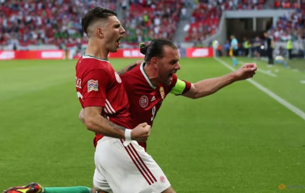 匈牙利队长多米尼克·索博斯勒在布达佩斯普斯卡什体育场对阵立陶宛的比赛中控球。