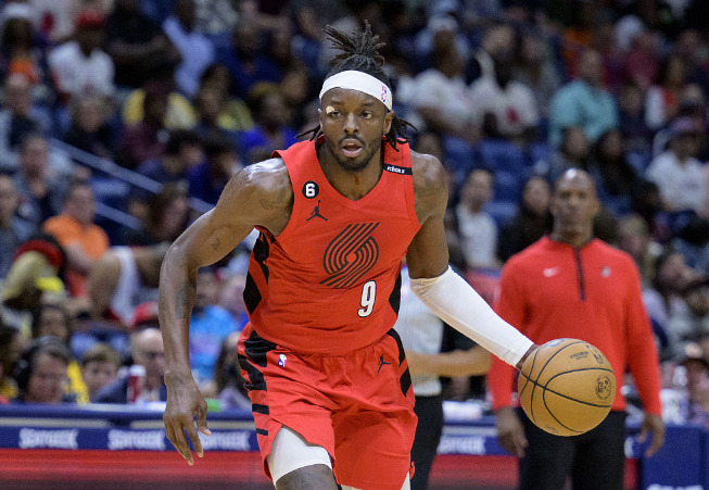 吉祥坊波特兰开拓者队的杰拉米·格兰特在对阵新奥尔良鹈鹕队的比赛中运球。